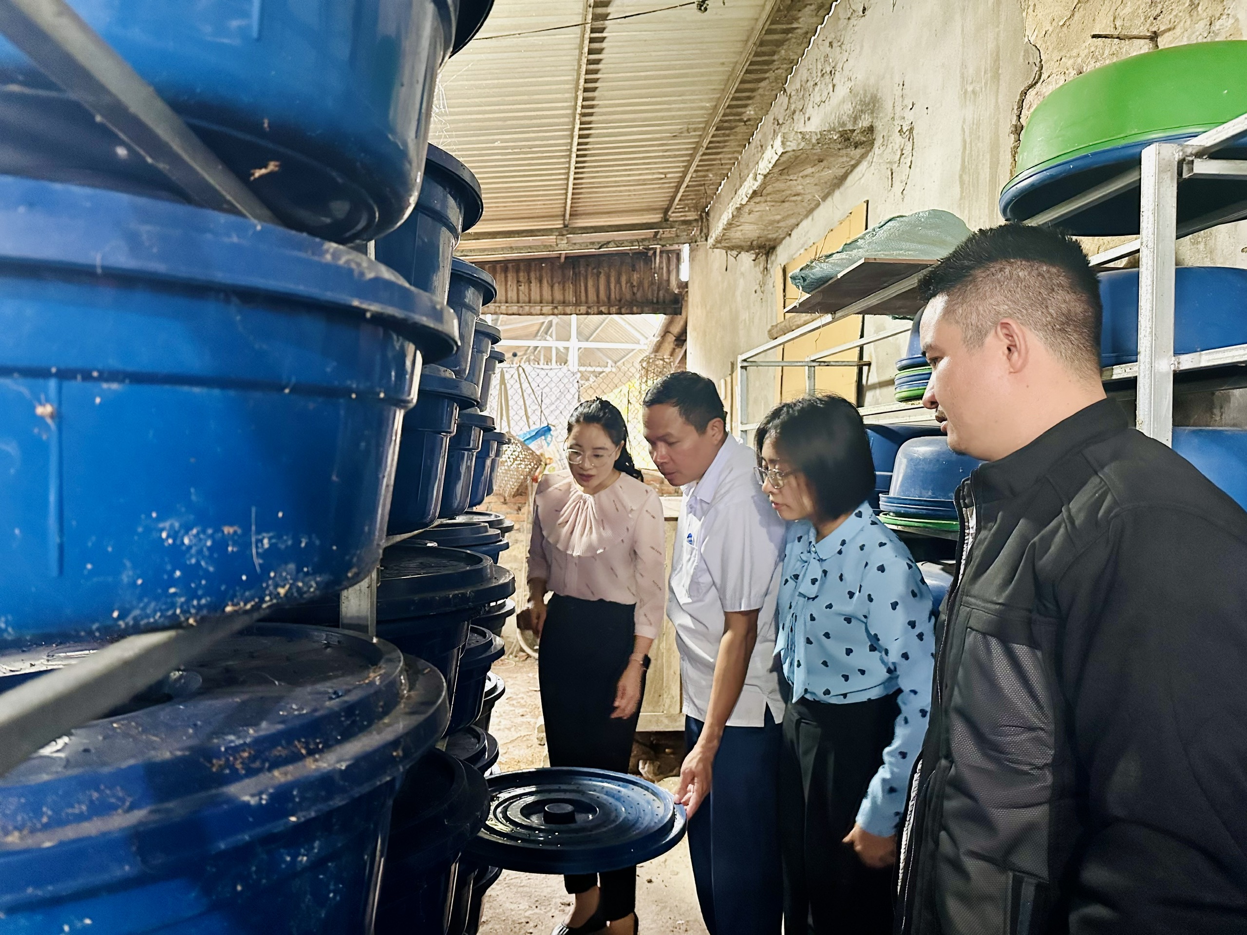 Các đồng chí lãnh đạo xã thăm mô hình nuôi ốc nhồi của hộ anh Bàn Văn Nghĩa, thôn tân Thành.