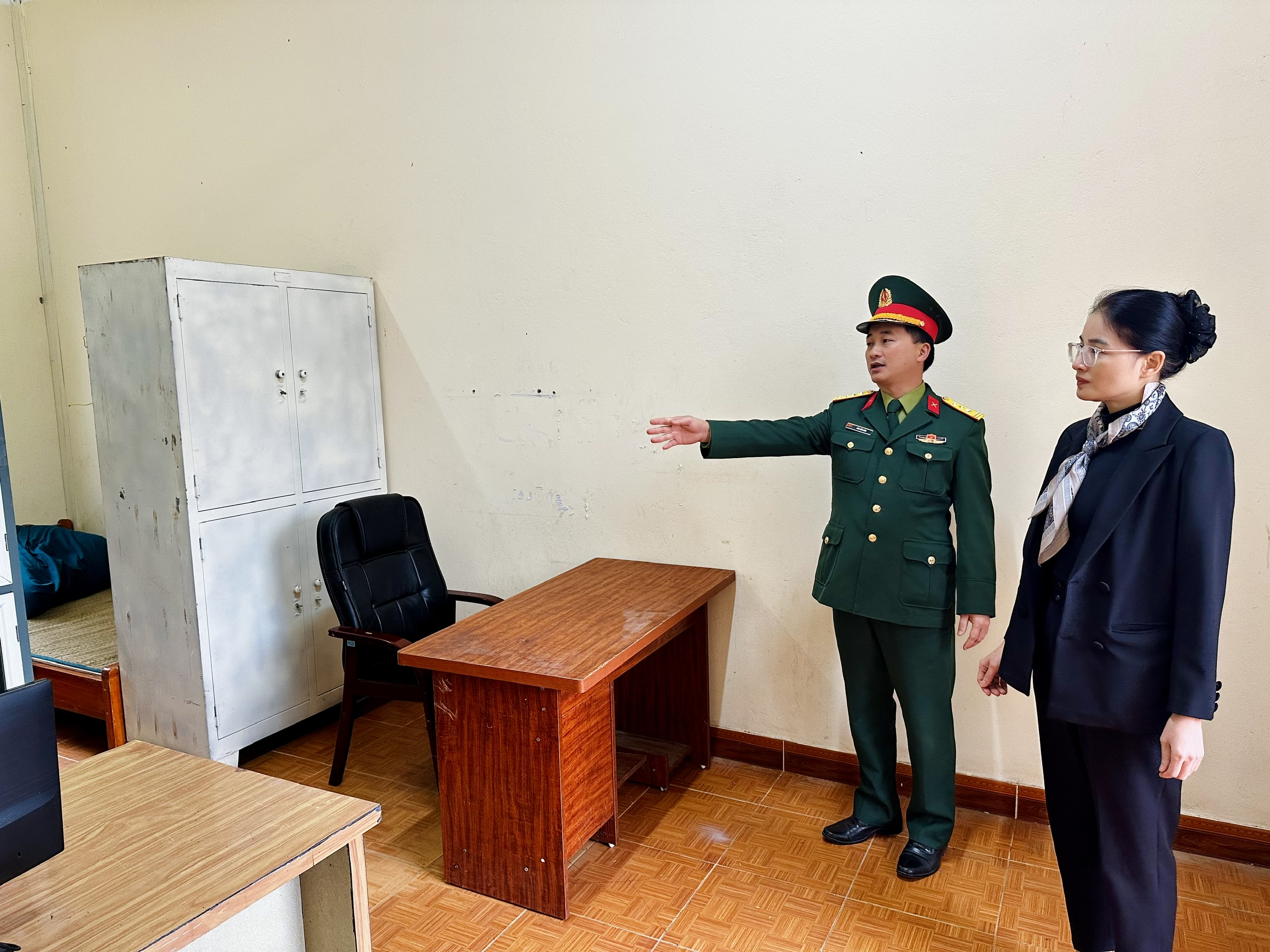 Đồng chí Hứa Thị Hà, Bí thư Đảng ủy, Chủ tịch HĐND xã kiểm tra việc bố trí phòng làm việc, đảm bảo cơ sở vật chất, nơi sinh hoạt cho lực lượng cán bộ, chiến sỹ Ban CHQS xã Minh Thanh.
