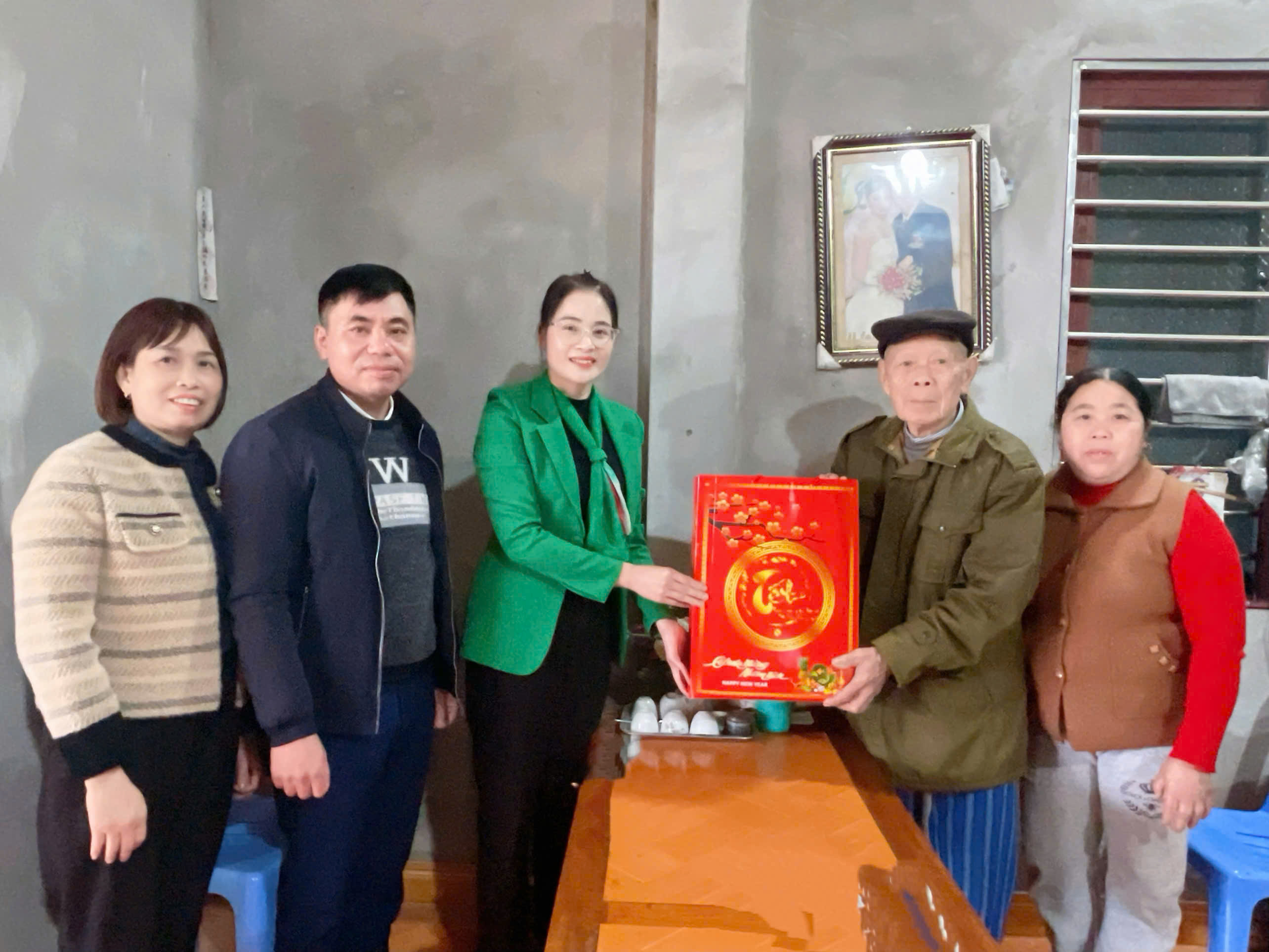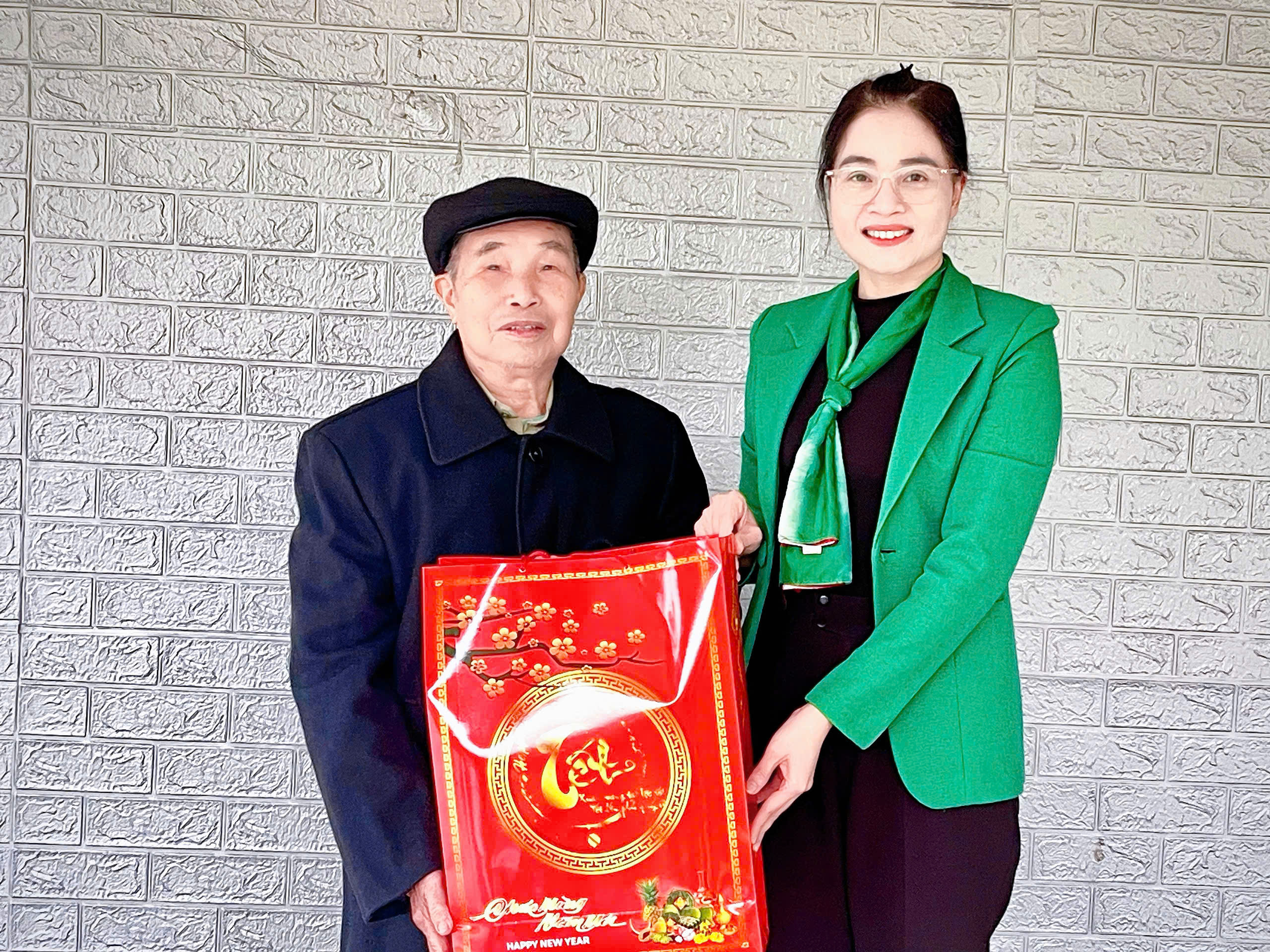 Đồng chí Hứa Thị Hà, Bí thư Đảng ủy, Chủ tịch HĐND xã, tặng quà ông Trần Minh Đức, nguyên Thường trực Đảng ủy xã Minh Thanh.