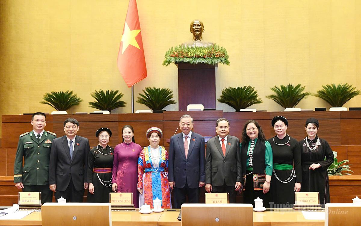 Đoàn đại biểu Quốc hội tỉnh Tuyên Quang khóa XVI, nhiệm kỳ 2026-2031 chụp ảnh cùng Tổng Bí thư Tô Lâm và Chủ tịch Quốc hội khóa XV Trần Thanh Mẫn.