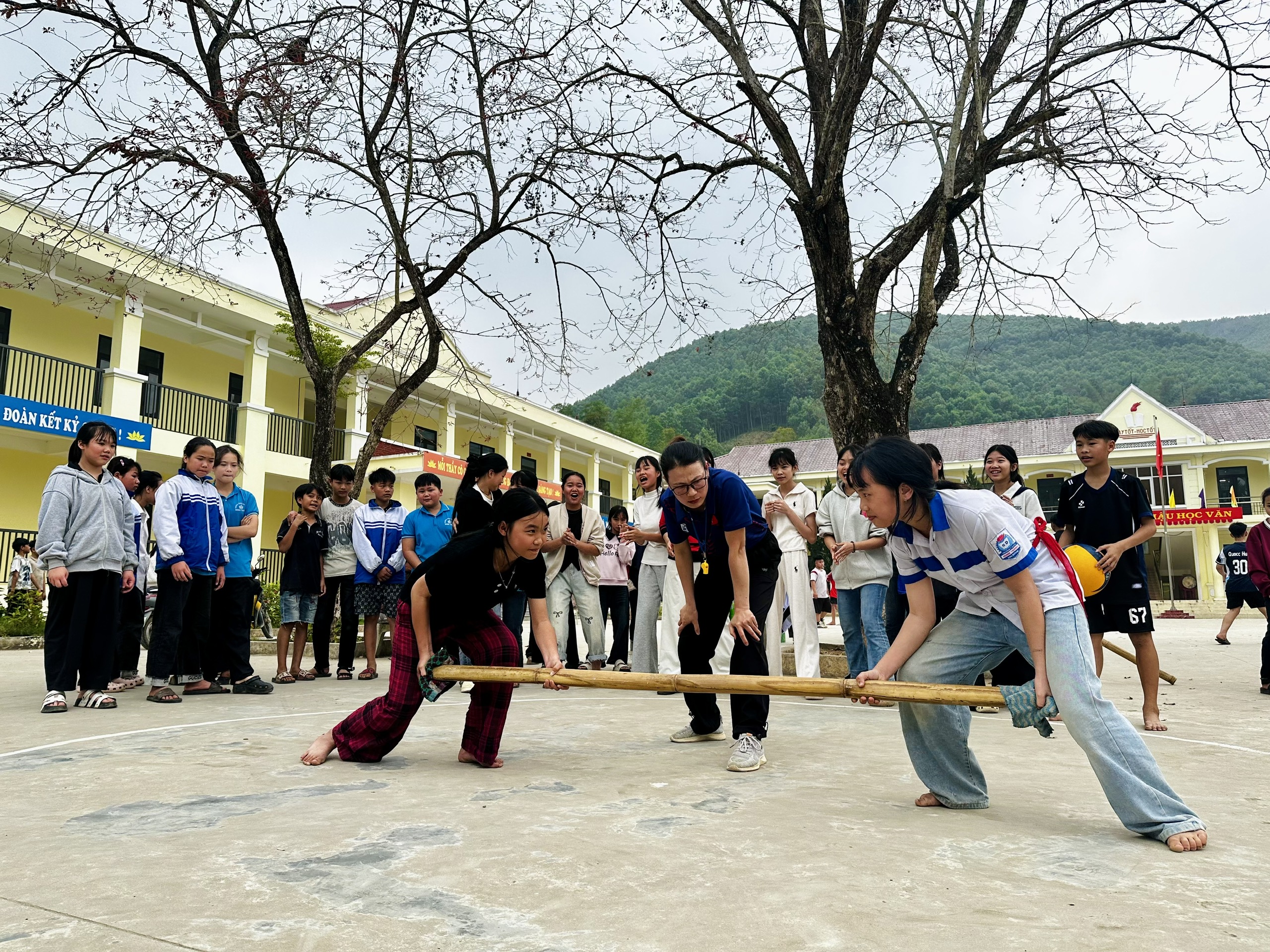 Các e học sinh trường THCS Minh Thanh thi đấu môn đẩy gậy.