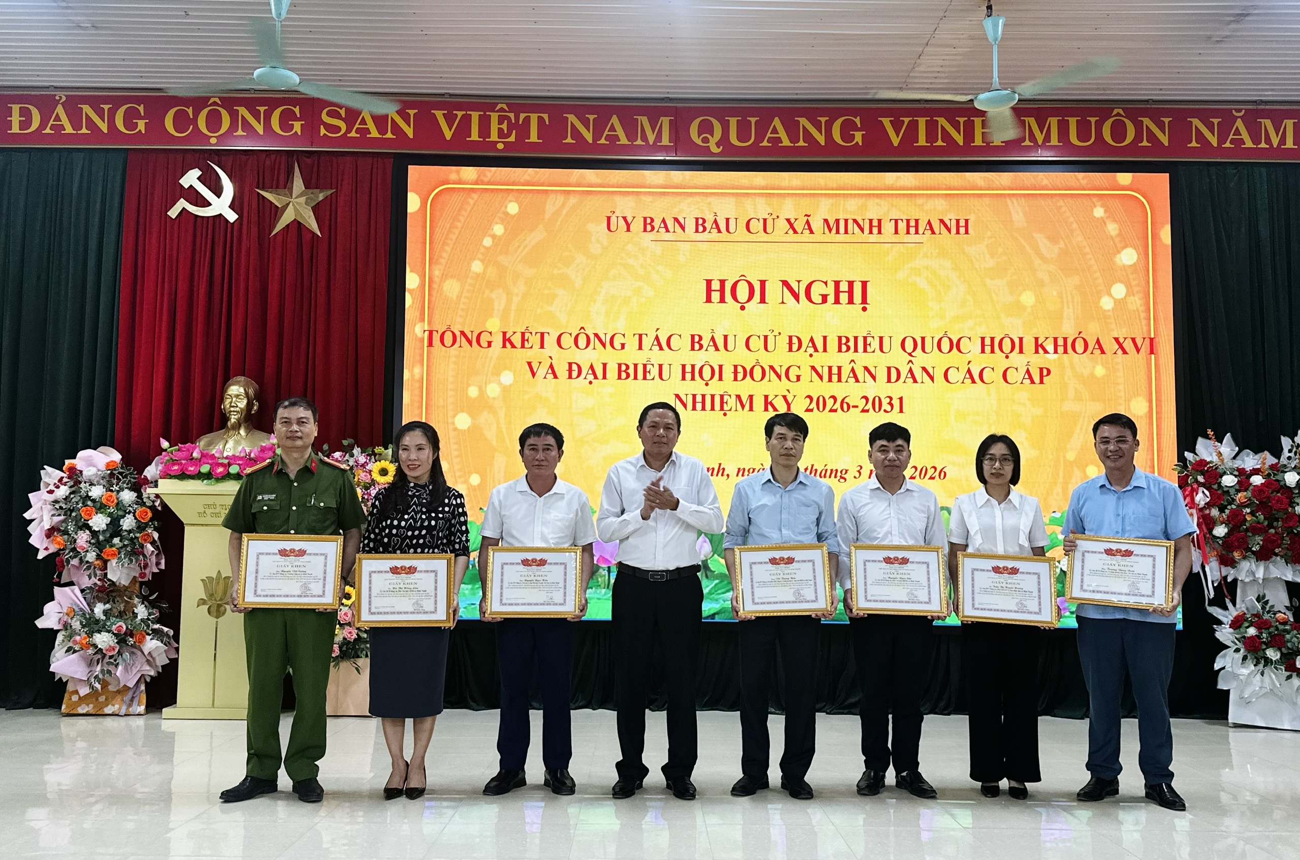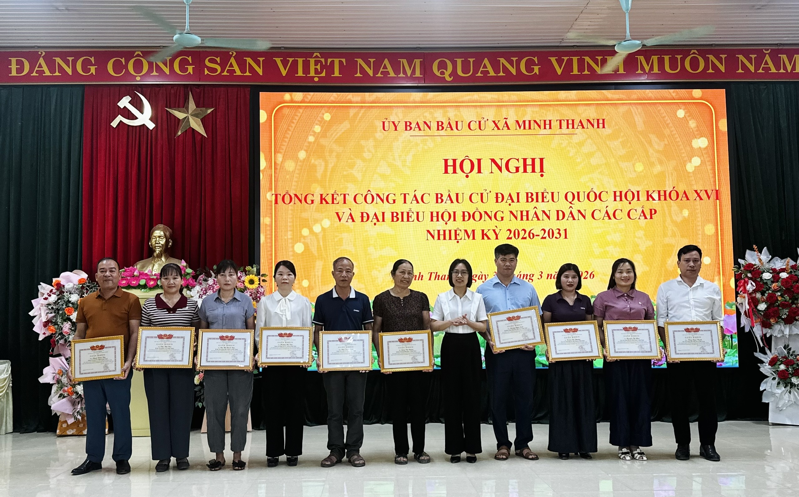 Nhân dịp này, UBND xã Minh Thanh đã biểu dương, khen thưởng 17 tập thể và 103 cá nhân có thành tích xuất sắc trong công tác bầu cử đại biểu Quốc hội khóa XVI và đại biểu HĐND các cấp nhiệm kỳ 2026–2031.