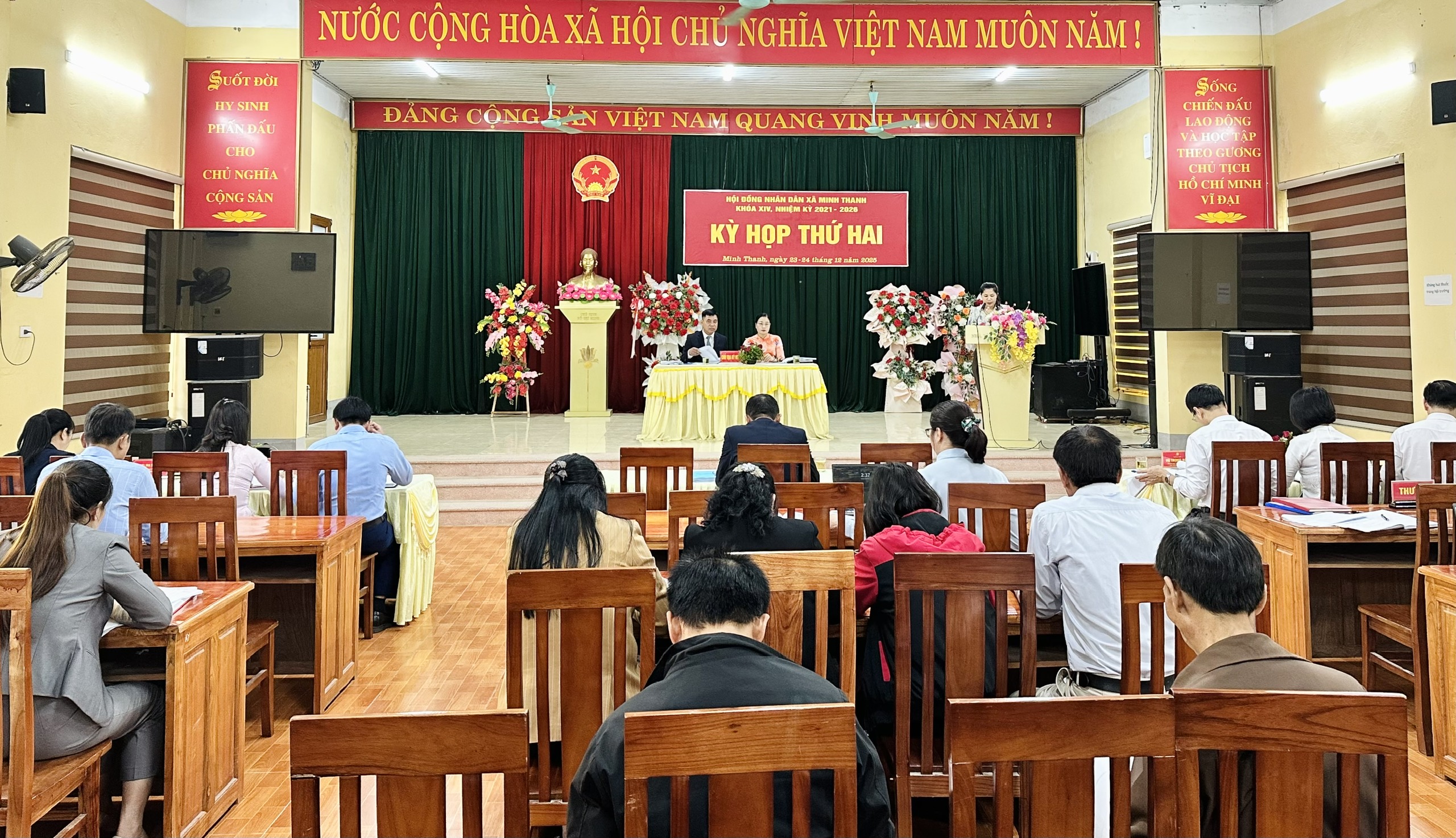 Đồng chí Hứa Thị Hà, Bí thư Đảng ủy, Chủ tịch HĐND xã Minh Thanh; Nguyễn Ngọc Sản, Ủy viên Ban Chấp hành Đảng bộ, Phó Chủ tịch HĐND xã, chủ trì phiên họp. Tham dự phiên họp có đồng chí Bùi Xuân Mừng, Phó Bí thư Đảng uỷ, Chủ tịch UBND xã; cùng các đồng chí Ủy viên Ban Thường vụ Đảng ủy; Thường trực HĐND xã; lãnh đạo UBND xã; lãnh đạo Ủy ban Mặt trận Tổ quốc Việt Nam xã và các đại biểu HĐND xã khóa XIV.