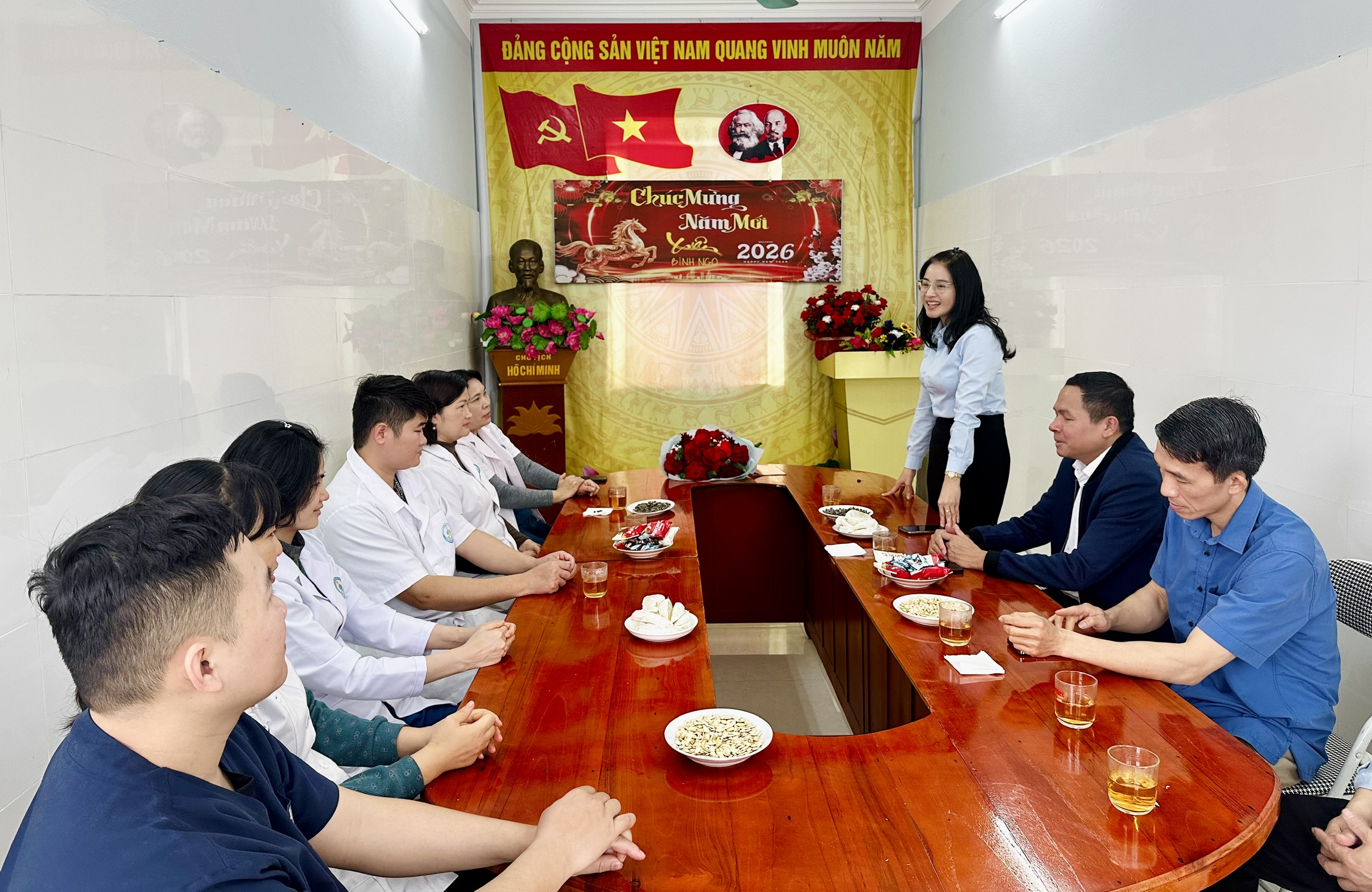 Phát biểu tại buổi gặp mặt, đồng chí Hứa Thị Hà, Bí thư Đảng ủy, Chủ tịch HĐND xã ghi nhận, biểu dương những nỗ lực, cố gắng của tập thể cán bộ, nhân viên Trạm Y tế trong công tác chăm sóc, bảo vệ sức khỏe Nhân dân thời gian qua. Đồng chí mong muốn thời gian tới, đơn vị tiếp tục phát huy tinh thần đoàn kết, nâng cao chất lượng chuyên môn, phối hợp chặt chẽ với cấp ủy, chính quyền địa phương, hoàn thành tốt nhiệm vụ được giao, đáp ứng yêu cầu chăm sóc sức khỏe Nhân dân trong tình hình mới.