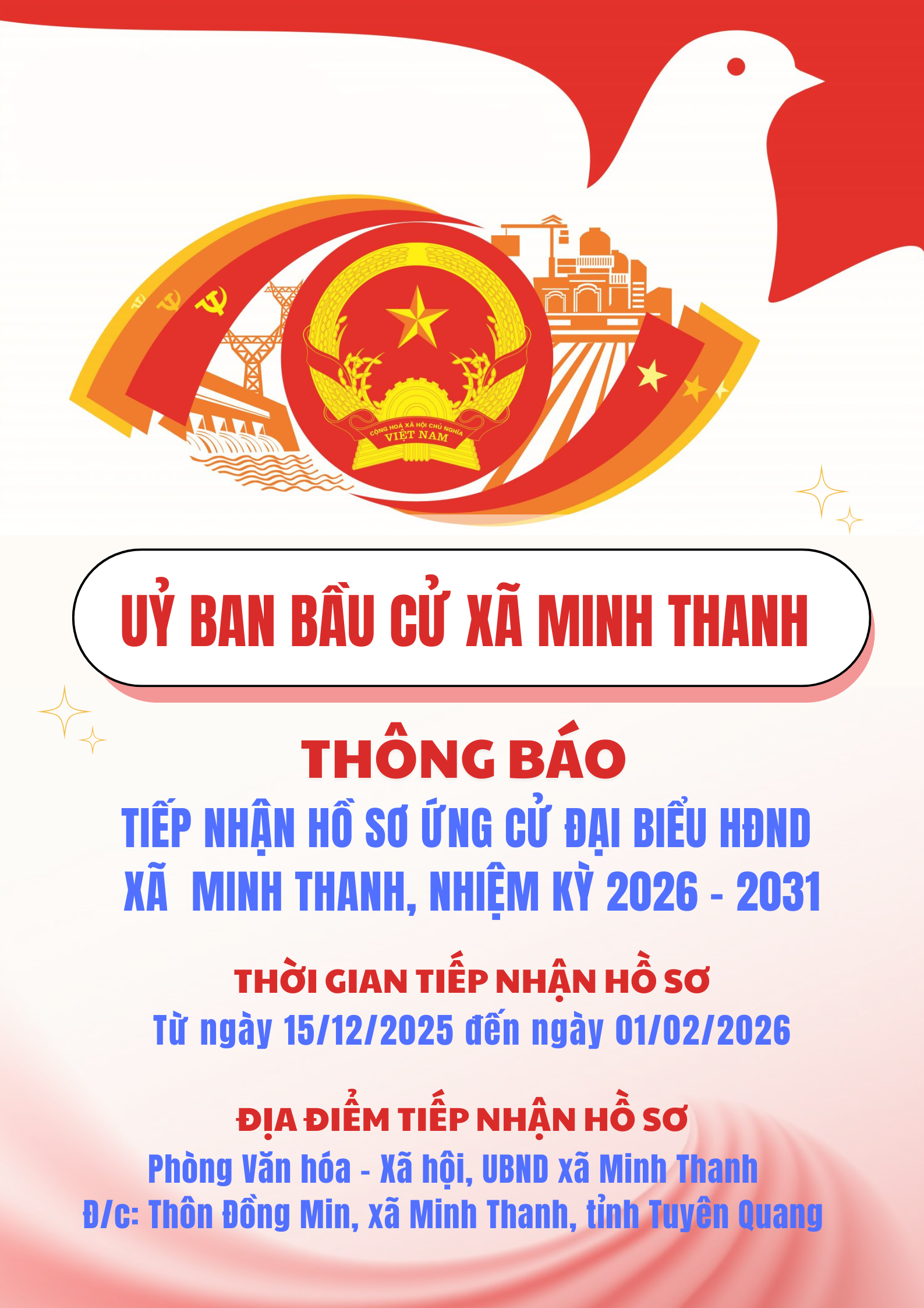 Ủy ban bầu cử xã Minh Thanh ban hành thông báo số 02/TB-UBBC ngày 12/12/2025 về thời gian, địa điểm tiếp nhận hồ sơ ứng cử đại biểu HĐND xã Minh Thanh, nhiệm kỳ 2026 - 2031