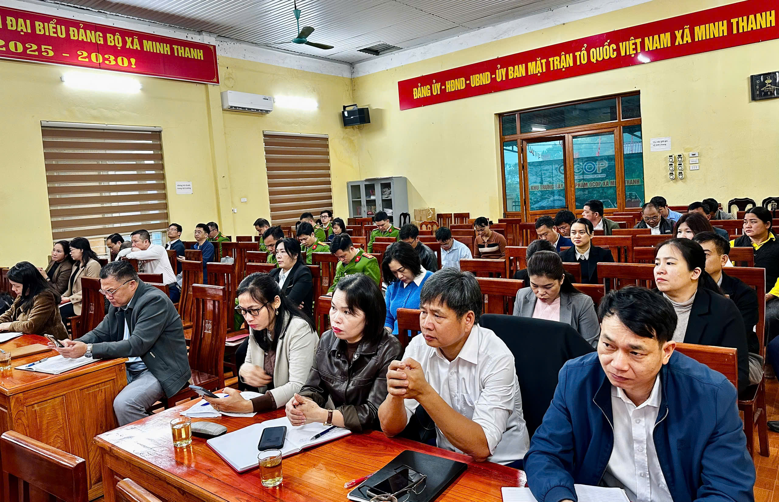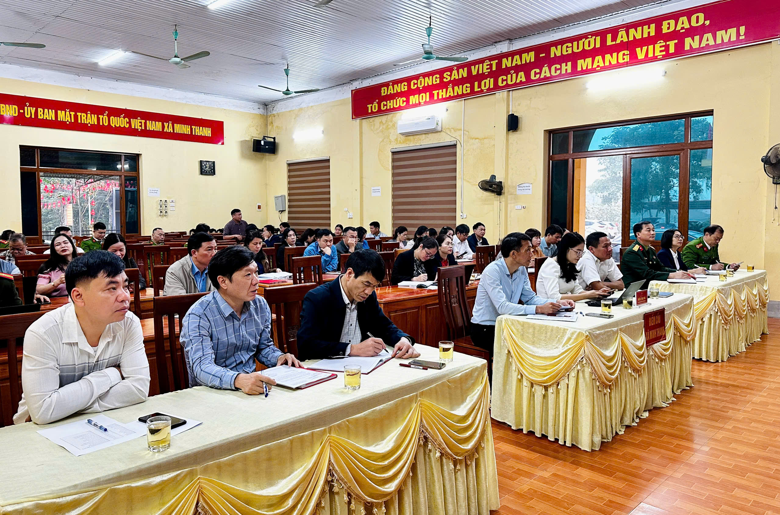 Dự tại điểm cầu xã Minh Thanh có các đồng chí: Hứa Thị Hà, Bí thư Đảng ủy, Chủ tịch HĐND xã; Hà Đình Cường, Phó Bí thư Thường trực Đảng ủy; Bùi Xuân Mừng, Phó Bí thư Đảng ủy, Chủ tịch UBND xã. Các đồng chí Ủy viên Ban Thường vụ Đảng ủy; Ủy viên BCH Đảng bộ xã; lãnh đạo HĐND, UBND, Ủy ban MTTQ; lãnh đạo các cơ quan, đơn vị, Bí thư chi bộ, Trưởng thôn trên địa bàn xã.